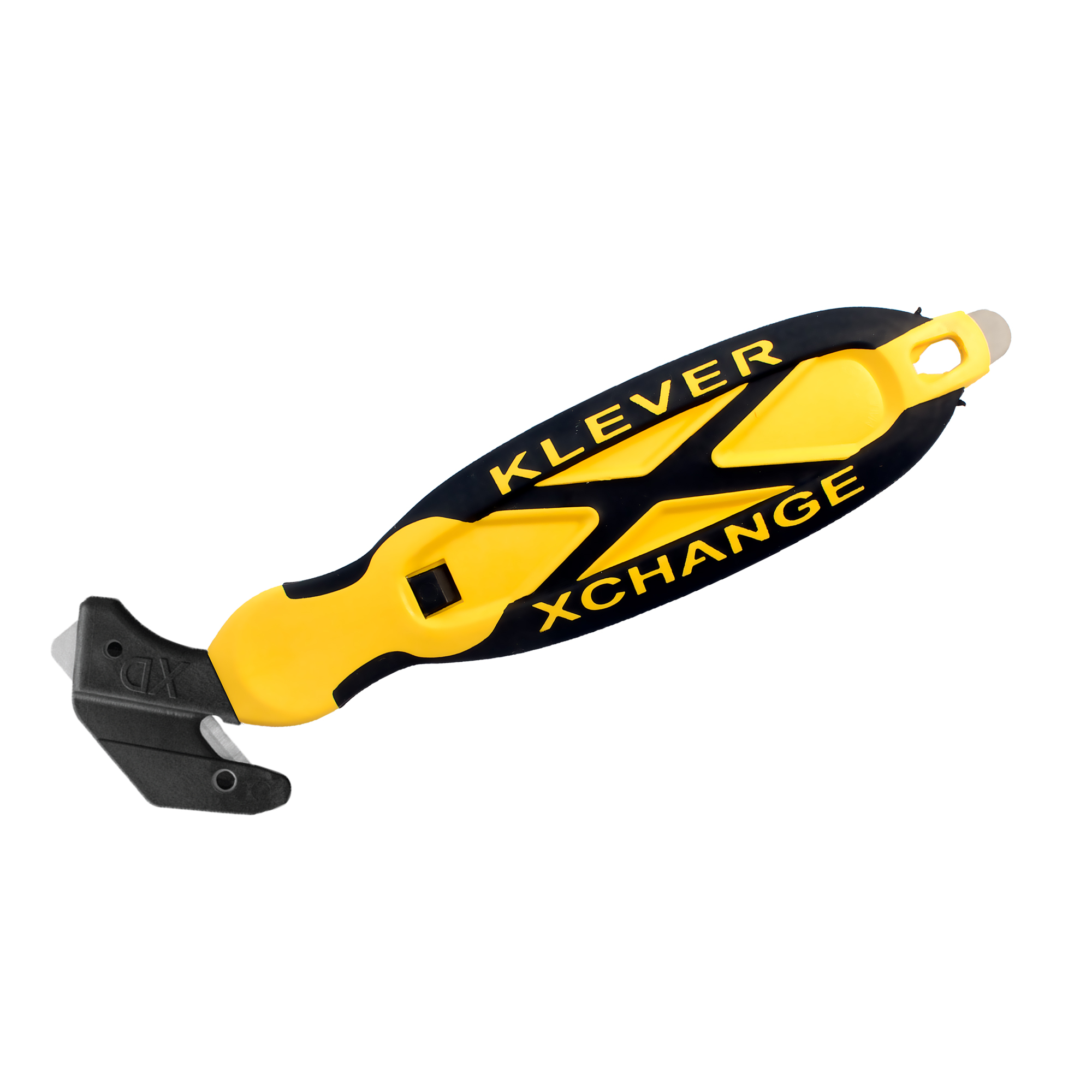 Reduce cut injuries and protect your goods with the KLEVER X-CHANGE PLUS, a lightweight, concealed cutter designed for safety and versatility. Effortlessly cuts cardboard, boxes, strapping, shrink wrap, bubble wrap, and more.