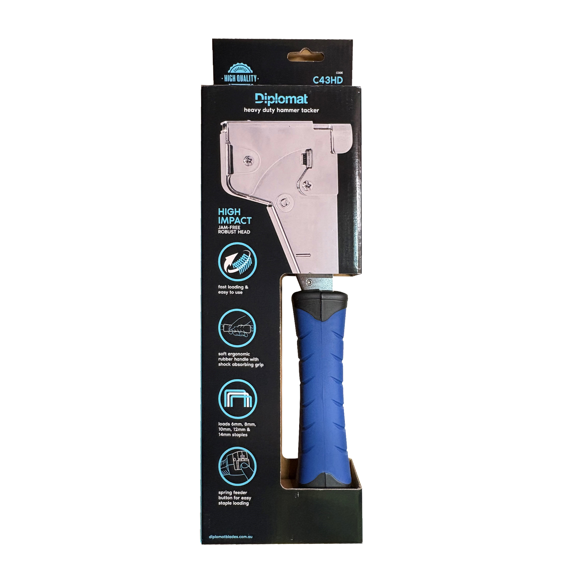 Diplomat C43HD Heavy-Duty Hammer Tacker features an ergonomic rubber grip for vibration control. Its jam-free mechanism is ideal for professional fixing jobs; securing flooring underlay, roofing felt, sisational/wall wrap, breather membrane and more.