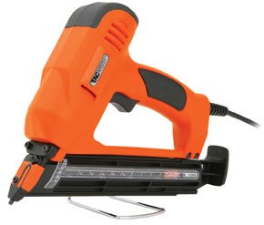 Staple tacker/nailer with long power cord, wide ergonomic grip, on/off switch, belt hanger, tough polymer lightweight body, light indicator, safety lock switch, trigger, air vents, bottom loading magazine and staple viewing window.