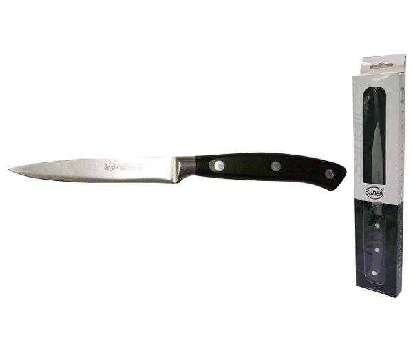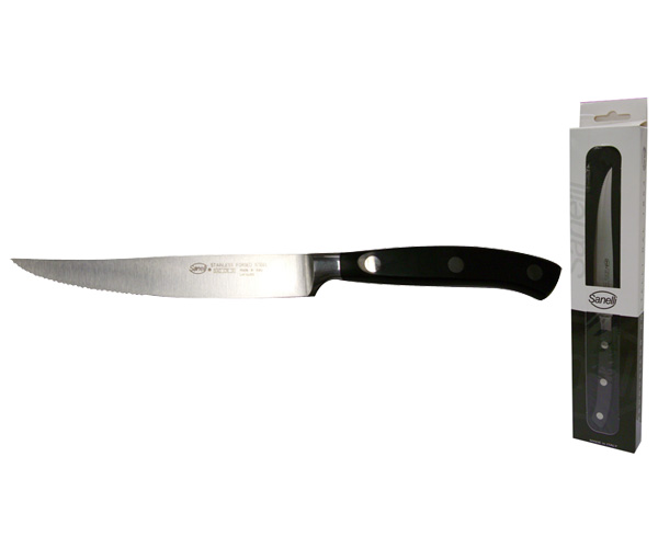 The Sanelli Ergoforge 327912 is a 12 cm forged steak knife with a semi-flex serrated stainless steel blade and ergonomic riveted handle. Made in Italy, it offers excellent balance, edge retention, and is ideal for steak, crusty bread, and more.