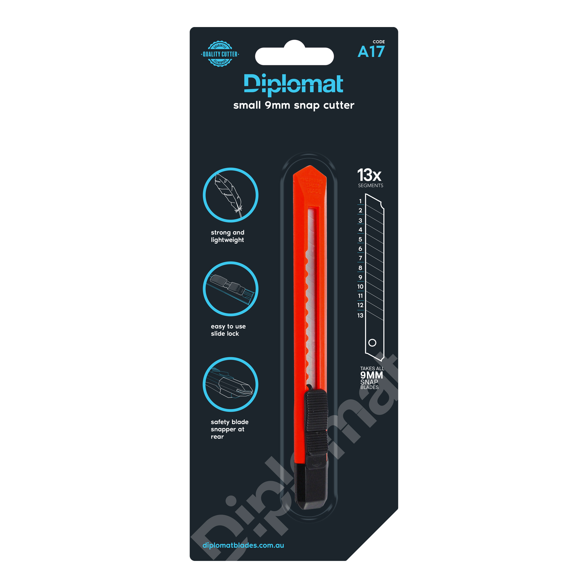 The Diplomat A17 is a compact 9mm snap cutter with a durable plastic body and slide lock for secure blade control. It includes a rear blade snapper and is compatible with all standard small 9mm snap-off blades for precise, light-duty cutting.