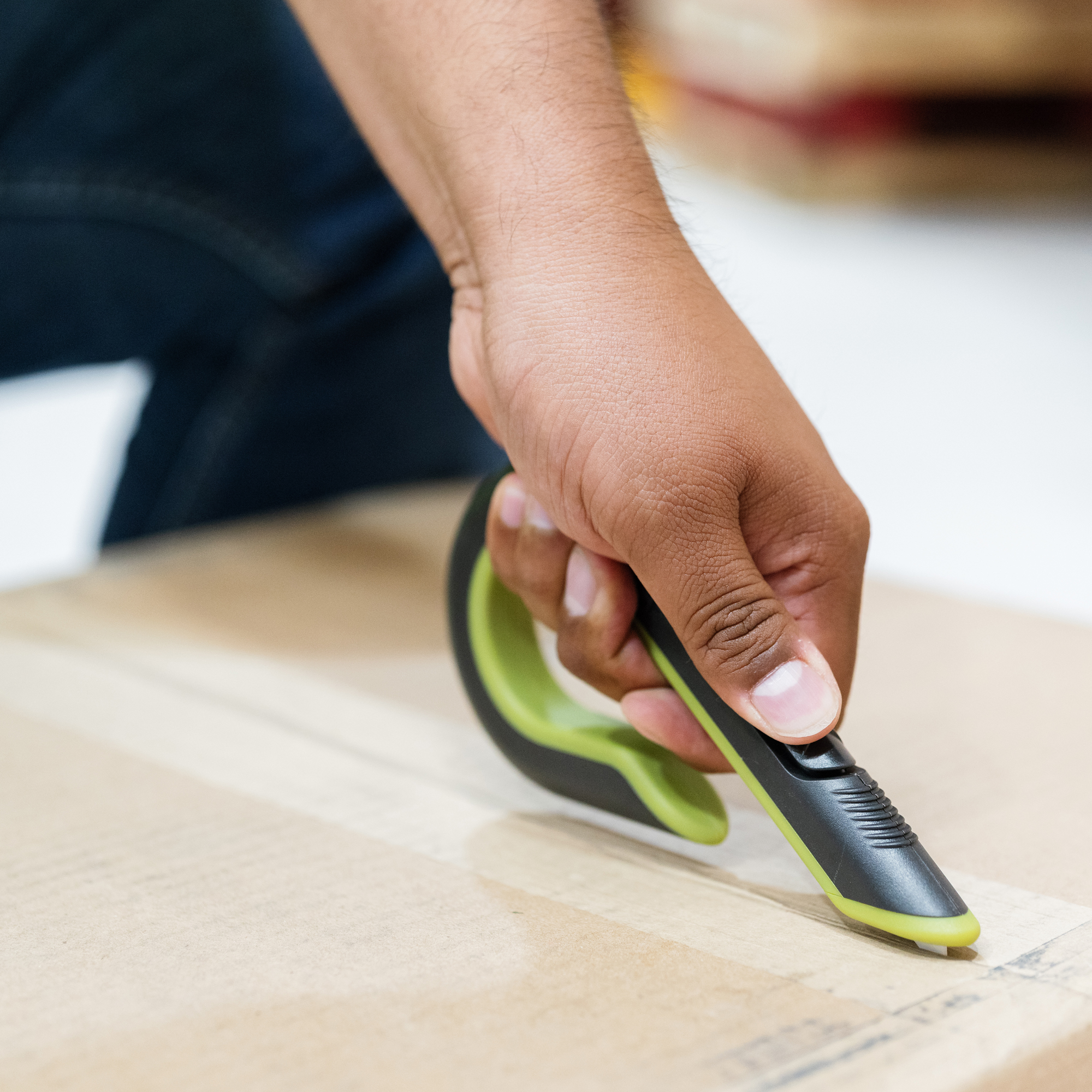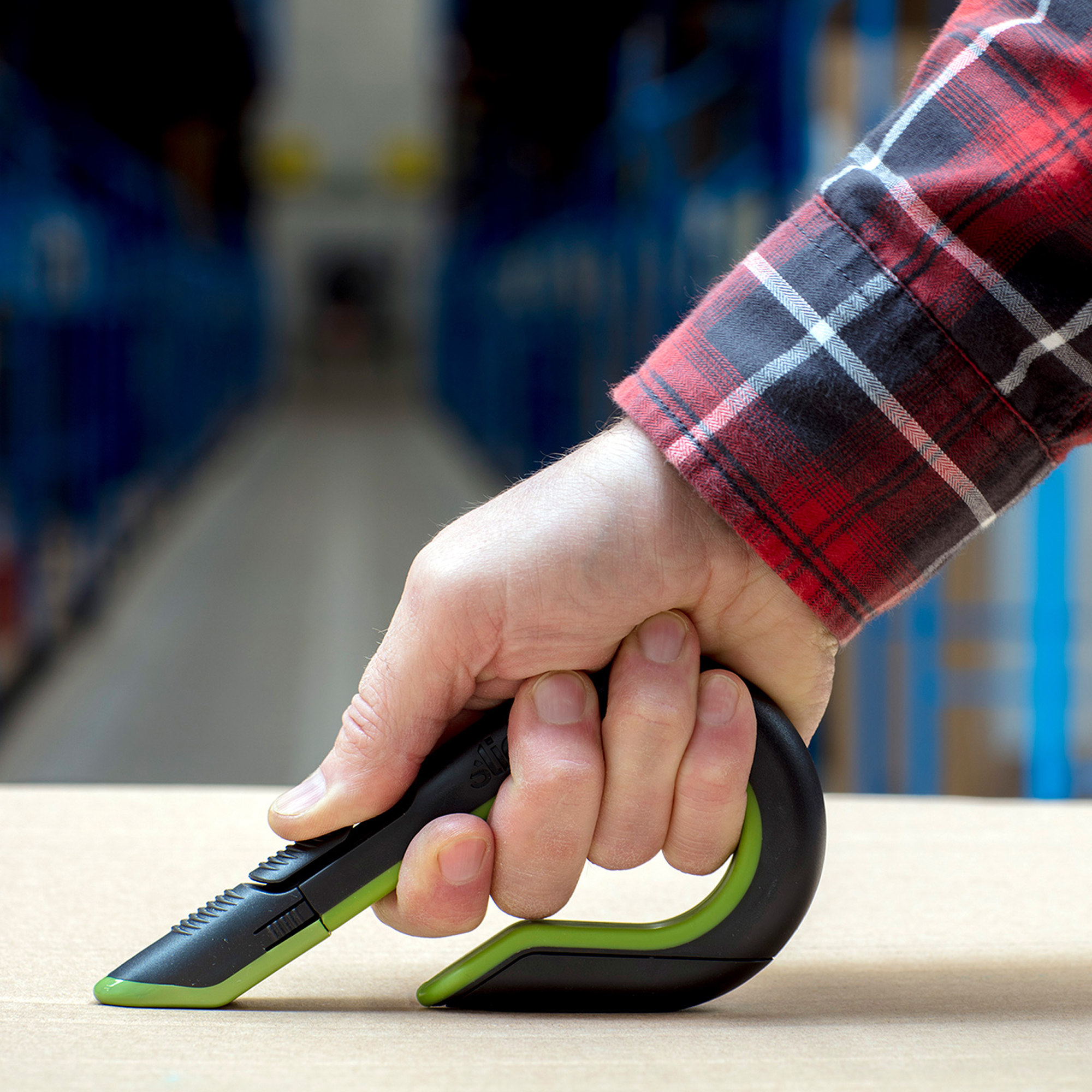 The Slice Auto-Retractable Box Cutters unique finger-friendly blade is safe to the touch and therefore causes fewer and less severe injuries than traditional blades. For additional safeguarding, a textured auto-retractable slider ensures the blade can never be accidentally left out. The cutter has a curved handle that comfortably wraps around your workers hands, and this award-winning design reduces wrist strain and keeps fingers shielded from debris such as staples.