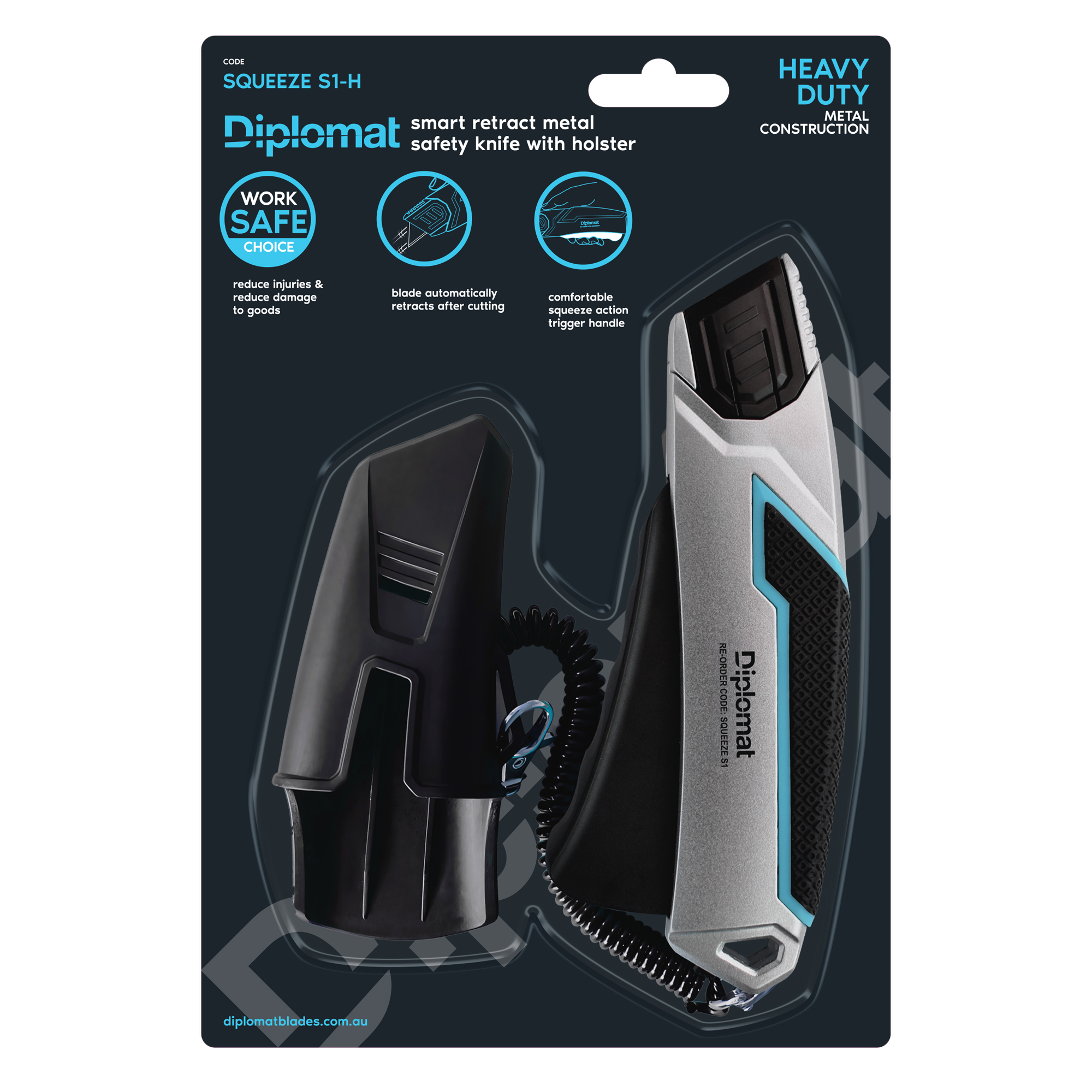 The Diplomat SQUEEZE S1-H Smart Retract Metal Safety Knife with Holster puts safety first with smart automatic blade retraction technology that reduces injuries and reduces damaged goods. The blade self-retracts when it loses contact with its cutting material, even if it is still engaged. The metal body makes it more durable and ready for heavy-duty work but still light and comfortable to hold. Convenient compact holster and lanyard included for extra safety.
