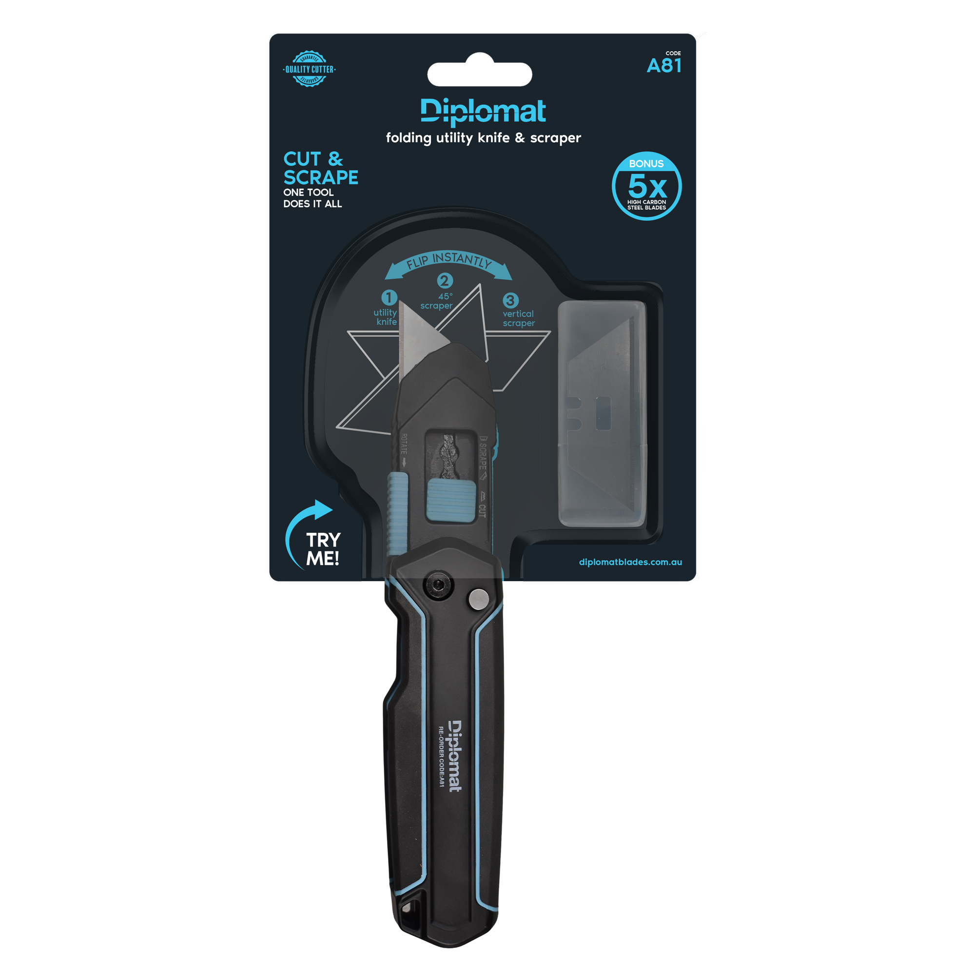 The Diplomat A81 Scraping Folding Utility Knife is a heavy-duty dual function tool designed for both cutting and scraping tasks. Built with a harden zinc alloy housing, it ensures long-lasting strength and reliability. The knife includes a bonus set of 5 high carbon steel blades, providing sharp, precise performance for tough jobs. With dual functionality scrape and cut, the A81 is ideal for industrial, trade, and DIY applications requiring versatility and durability.