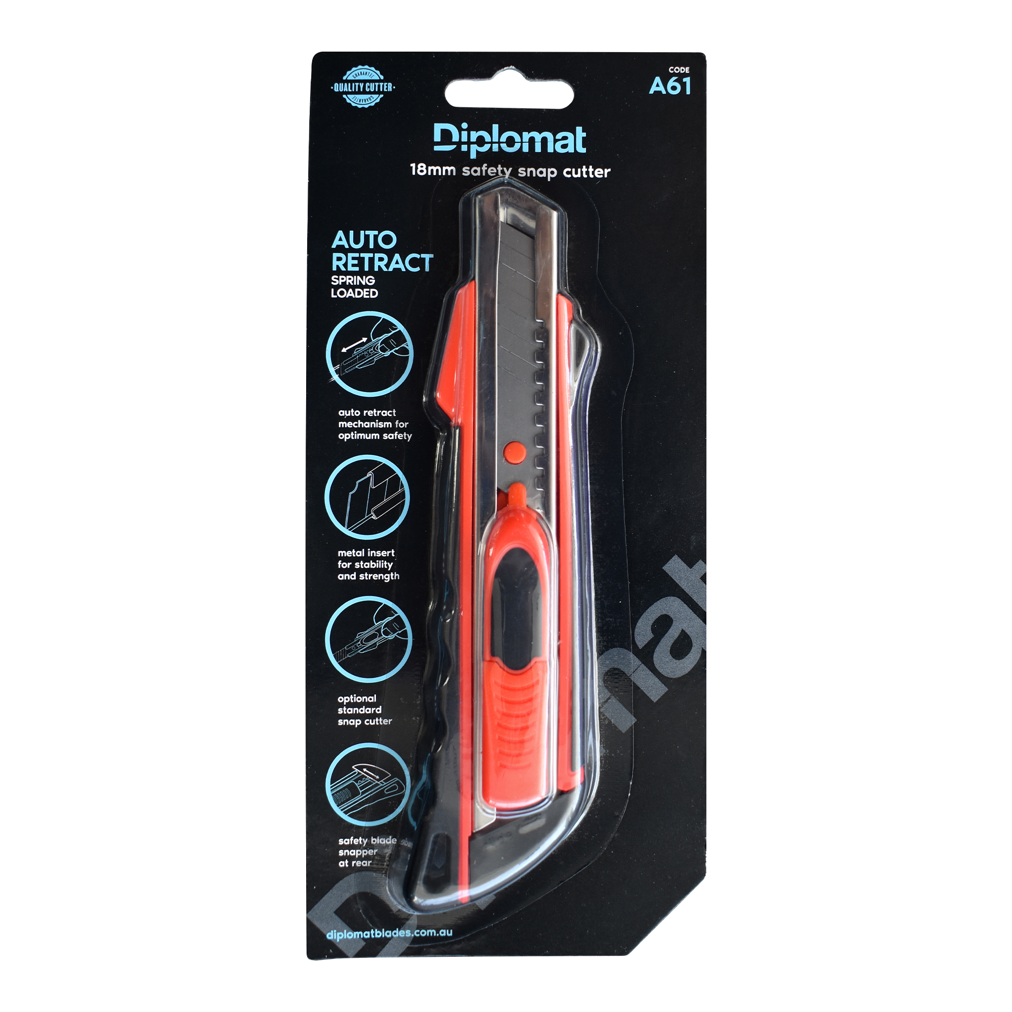 Diplomat A61 is a dual-action safety snap cutter with both a spring-loaded retractable blade (black slider) and standard snap cutter (red slider), plus a rear blade snapper. It's safe, versatile, and ideal for varied cutting tasks.