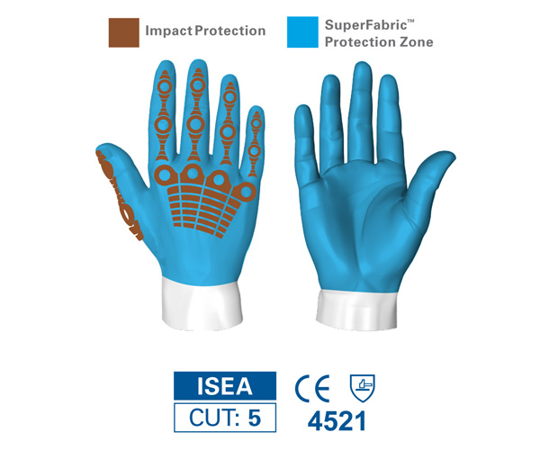 Back of hand impact protection. Synthetic leather palm enhances grip in dry and light oil applications, while providing dexterity to utilise tools and equipment. 360 degrees Level 5 cut resistance. Oil resistant. Launderable.