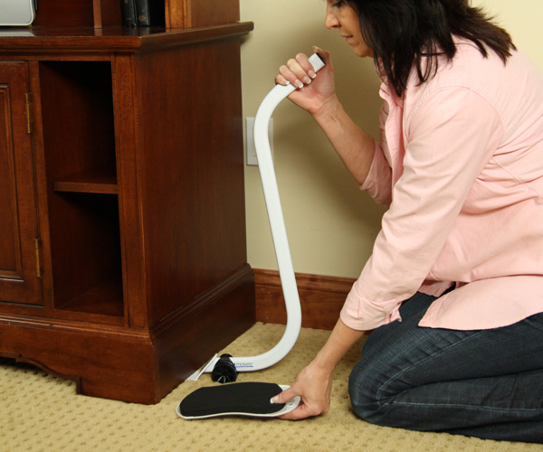 Pairing the NEW EZ Moves PowerMaxx Lifter with EZ Moves Furniture Slides can help reduce the risk of back injuries by eliminating the need to lift and carry heavy items when moving. The specially designed EZ Moves PowerMaxx Lifter relieves the strain of tilting the furniture by giving you the leverage you need to safely and easily lift the corners of the furniture. Then simply place the furniture slides under the legs or corners of; furniture, filing cabinet, credenza, etc., and easily slide from room to room. This combination of tilting and sliding makes the moving process ergonomically complete. Although created to make placing EZ Moves Furniture Slides simple and ergonomically correct, the lifter is also a great tool to place area rugs under furniture, level adjustable legs, and clean under appliances and other items.