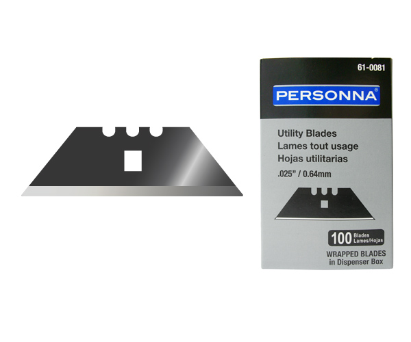 Personna 610081 is a heavy-duty utility blade with 3 notches, made in the USA from high-carbon steel. Measures 60mm X 19mm X 0.64mm (0.025"). Blue-coated for durability, individually wrapped, and packed 100 per box.