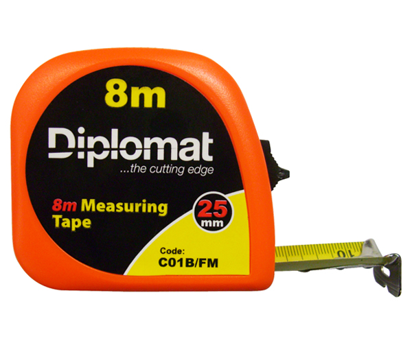 Diplomat C01B FM 8 m Tape Measure - Bright fluorescent right-angle case with 25 mm nylon-coated metal tape, auto-locking action, belt clip, and magnetic tip for precision measuring.
