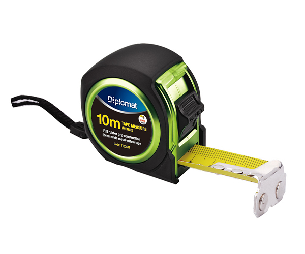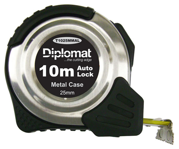 10 metre, metal casing with rubber grip 25mm wide auto lock, magnetic tip. Available in a display box of 12