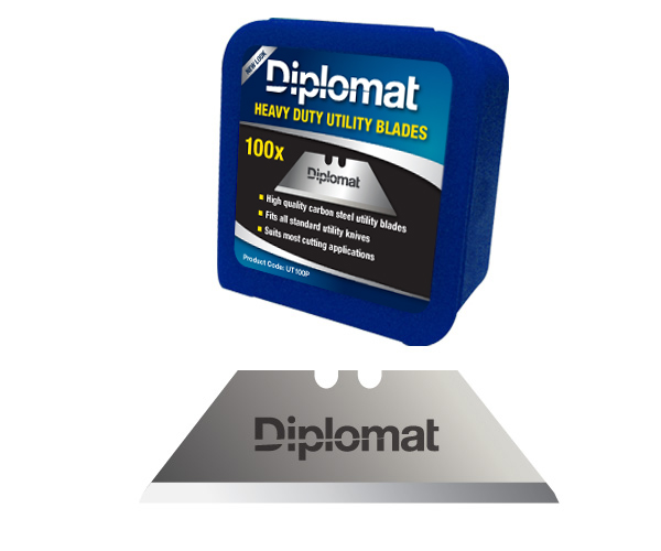 Diplomat A05DY extra-heavy-duty utility blades (approx.59mm X 19mm X 0.63mm thick) made from carbon steel. Supplied in a dispenser of 100 blades. Engineered for rugged cutting in all standard utility knives.